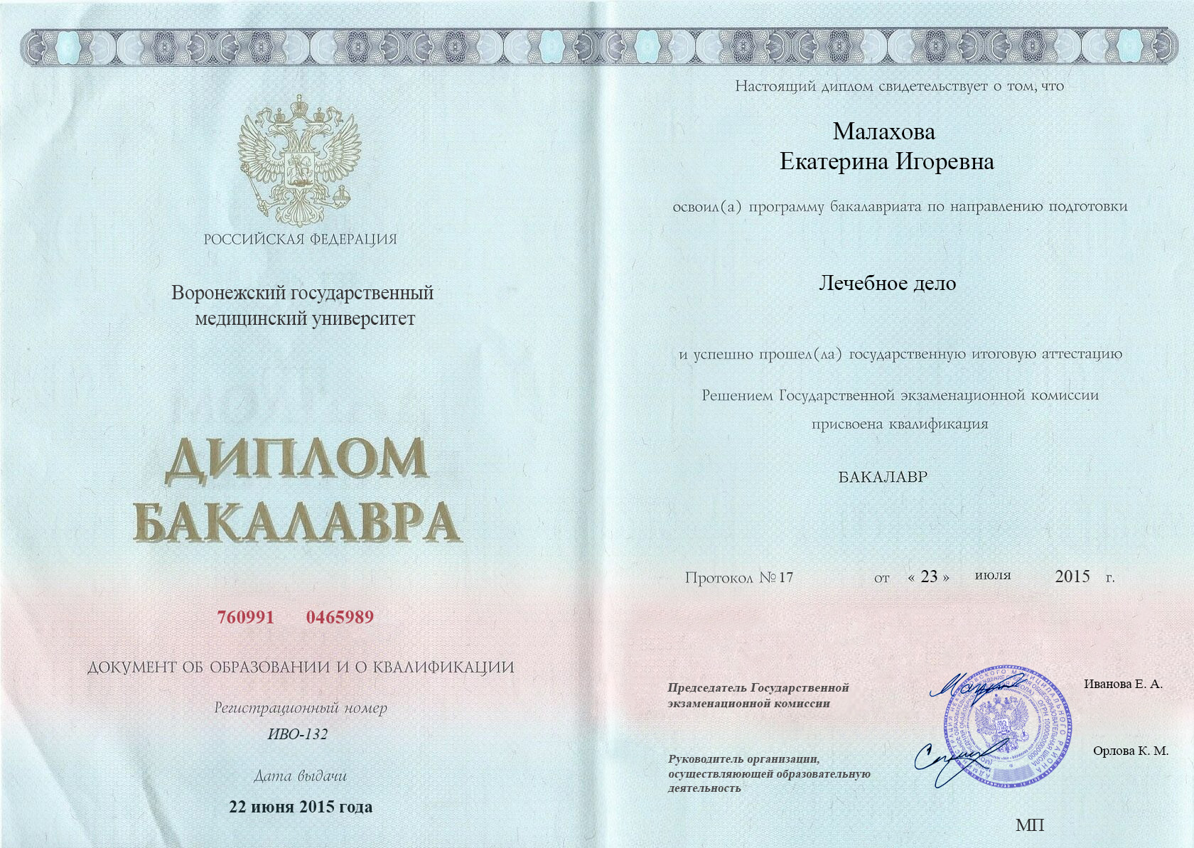 Диплом специалиста Малаховой Екатерины Игоревны