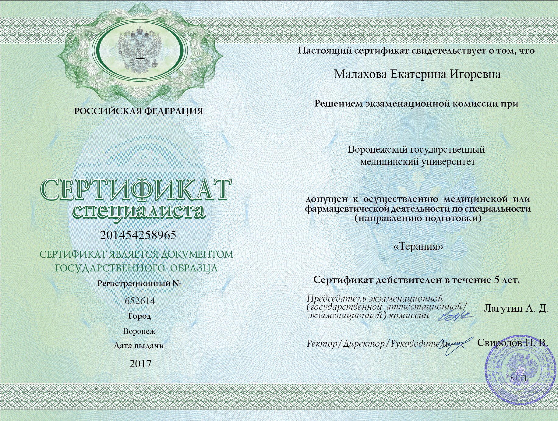 Сертификат специалиста Малаховой Екатерины Игоревны