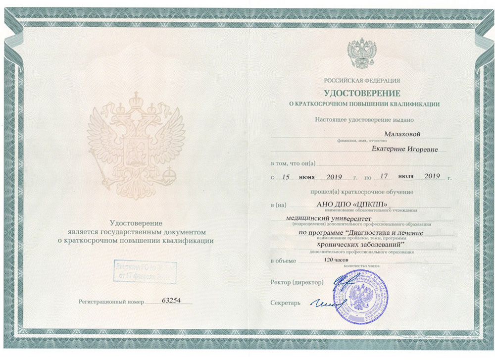 Удостоверение о квалификации Малаховой Екатерины Игоревны